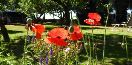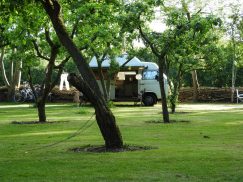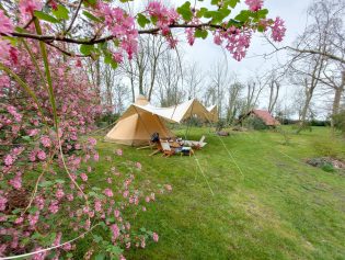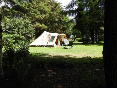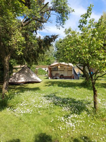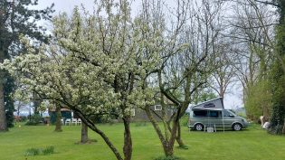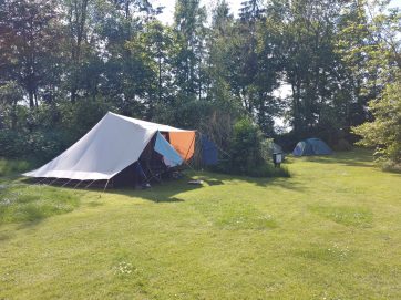 Onze camping telt 15 plekken. Het gevarieerde terrein ligt midden in het weidse land als een groene oase. Rondom de boerderij ligt een landschappelijke tuin en wandelbos. Op sommige plekken geniet je van het uitzicht op het landschap.  Caravans en campers staan in of dichtbij de boomgaard. Voor tenten zijn er wat privé plekken of gezellig op een veldje. Met mooie houtwallen waar ’s avonds best een muisje of een egel tevoorschijn kan komen. En wanneer we het geluk hebben van een mooie zonovergoten dag, dan is de zonsondergang bij de boomgaard vanuit de luie stoel te bewonderen. Genieten dus.  Geschikt voor tenten, caravans en campers tot 5,5  meter. Zeer geschikt voor fietskampeerders en wandelaars vanwege de ruime recreatieschuur met kookgelegenheid.